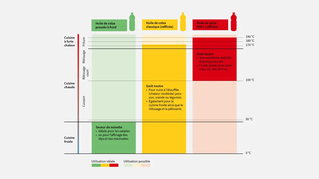 Pour la cuisine froide, les experts culinaires recommandent d’utiliser de l’huile de colza pressée à froid. Pour la cuisine chaude, il est recommandé d'utiliser l'huile de colza classique. Et pour saisir, rôtir et frire, optez idéalement pour l'huile de colza HOLL. -